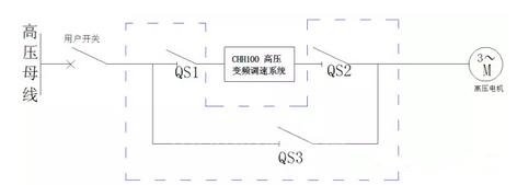 變頻調(diào)速系統(tǒng)由用戶開關(guān)、手動切換旁路柜、CHH100系列高壓變頻器、高壓電機組成。一拖一手動切換旁路柜是由三個高壓隔離開關(guān)QS1、QS2、QS3組成。手動旁路柜嚴(yán)格按照“五防”聯(lián)鎖要求設(shè)計,變頻器輸出QS2和旁路高壓隔離開關(guān)QS3機械閉鎖,完全能夠保證變頻調(diào)速系統(tǒng)安全運行。