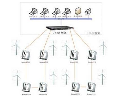 位于國(guó)內(nèi)北方有多處風(fēng)能發(fā)電區(qū),當(dāng)?shù)貙僦袦貛Т箨懶约撅L(fēng)氣候,地域遼闊,干燥少雨,風(fēng)能資源豐富。當(dāng)中一處,其應(yīng)用為中央監(jiān)控系統(tǒng)采用korenix(科洛理思)多光口的模塊化工業(yè)交換機(jī) JetNet 5628G,加上10口網(wǎng)管型工業(yè)交換機(jī) JetNet 4510建成不同規(guī)模的相切環(huán)型網(wǎng)絡(luò)。采用此種網(wǎng)絡(luò)架構(gòu),既保證了中央控制室對(duì)現(xiàn)場(chǎng)風(fēng)機(jī)SCADA監(jiān)控系統(tǒng)的穩(wěn)定性及可靠性,又實(shí)現(xiàn)現(xiàn)場(chǎng)風(fēng)機(jī)管理的易于維護(hù)性。