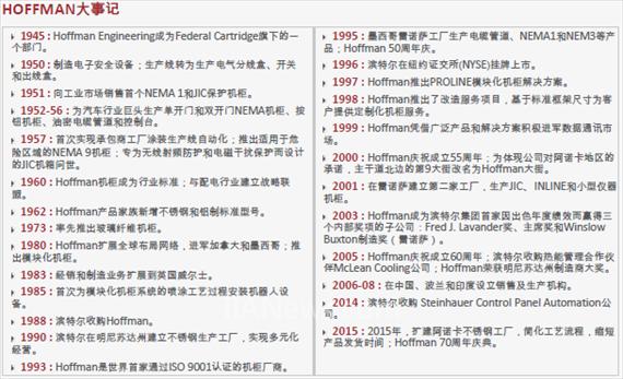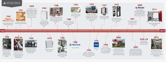 回顧70年的風(fēng)風(fēng)雨雨,Hoffman Engineering即使面對(duì)嚴(yán)峻的經(jīng)濟(jì)形勢(shì),也能靈活應(yīng)對(duì)瞬息萬(wàn)變的競(jìng)爭(zhēng)環(huán)境,不斷成長(zhǎng),拓展業(yè)務(wù),推進(jìn)業(yè)務(wù)的多元化。Hoffman Engineering發(fā)展道路上的里程碑包括:開(kāi)發(fā)新產(chǎn)品線(xiàn)、組織戰(zhàn)略聯(lián)盟、實(shí)施兼并收購(gòu)、布局全球制造設(shè)施、推出定制化項(xiàng)目、通過(guò)國(guó)際ISO 9001認(rèn)證和榮膺多項(xiàng)性能大獎(jiǎng)。得益于對(duì)創(chuàng)新和客戶(hù)滿(mǎn)意度的不懈追求,Hoffman Engineering 為全球電氣機(jī)柜和冷卻產(chǎn)品樹(shù)立了全新的標(biāo)準(zhǔn)。隨著企業(yè)的不斷成長(zhǎng)以及全球化進(jìn)程的不斷深入,我們將再接再厲,勇攀高峰,繼續(xù)為全球工業(yè)自動(dòng)化行業(yè)提供高質(zhì)量產(chǎn)品及服務(wù),這是我們的愿景,也是我們的使命。