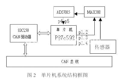 傳感器采用磁場三分量測量模塊,電場三分量測量模塊,傾角2分量測量模塊。信號處理電路中將各信號進(jìn)行放大和濾波,放大采用兩片LM148四運放,濾波器是由運算放大器構(gòu)成的兩個有源低通濾波二階節(jié)的級聯(lián)。單片機系統(tǒng)將電場三分量信號、磁場三分量信號和兩個姿態(tài)角信號共8路信號輪流選通送入A/D進(jìn)行轉(zhuǎn)換,A/D轉(zhuǎn)換選用B-B公司生產(chǎn)的16位芯片ADS7805,其輸入電壓范圍為±10V,輸出16位和8位可選,這里使用16位并行輸出,其控制信號由單片機的口線P1.0、P1.1和P1.2產(chǎn)生,單片機系統(tǒng)的結(jié)構(gòu)框圖如圖2所示。單片機采用PHILIPS的是有再片CAN功能的微控制器P87C592,晶振頻率為16MHz,P0口和P2口用作數(shù)據(jù)線和地址線,P4口和P5口用作16位模數(shù)轉(zhuǎn)換器的高8位和低8位并行數(shù)據(jù)線。P1.6、P1.7用于CAN總線,P1.2、P1.3和P1.4控制八選一多路轉(zhuǎn)換器MAX308的通道。PC82C250為CAN總線收發(fā)器,是CAN控制器和物理總線間的接口,提供對總線的驅(qū)動發(fā)送能力、對CAN控制器的差動發(fā)送能力和對CAN控制器的差動接收能力。它有很強的抗瞬間干擾和保護總線的能力;有3種不同的工作方式即高速、斜率控制和待機??偩€上的某節(jié)點掉電不會影響總線,在40m內(nèi)實現(xiàn)高速應(yīng)用可達(dá)1Mbps。主機接收端使用PCL-841,PCL-841可直接插在計算機的ISA擴展槽內(nèi),計算機為PCL-841分配內(nèi)存地址,并將其作為標(biāo)準(zhǔn)內(nèi)存進(jìn)行讀寫,內(nèi)存地址可通過跳線設(shè)置為C800H至EF00H中40個基地址中的任一個。是內(nèi)置CAN控制器的CAN總線通信卡,它提供總線仲裁和錯誤檢測并自動重發(fā)送功能,從而避免了數(shù)據(jù)丟失,保證了系統(tǒng)的可靠性。