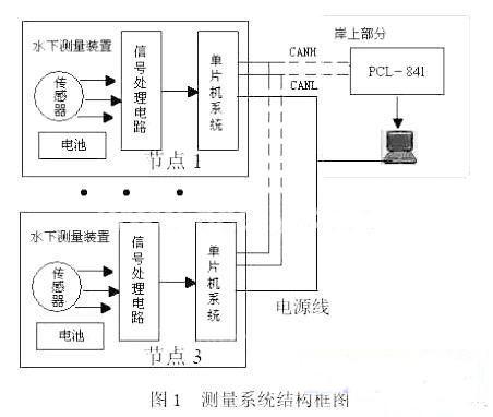 遠(yuǎn)程數(shù)據(jù)采集系統(tǒng)要求傳感器與測量裝置位于測量現(xiàn)場,計算機系統(tǒng)在岸上或船上,它們之間距離經(jīng)常在幾百米,有時甚至達(dá)到幾公里。因此,連接導(dǎo)線少,維護費用低就顯得尤為重要。本文中測量系統(tǒng)針對磁場(3分量)、電場(3分量)、傾角參數(shù)(2分量),用CAN來構(gòu)建遠(yuǎn)程水下數(shù)據(jù)采集系統(tǒng),采用3個測量節(jié)點,分別對上述8路傳感器信號實現(xiàn)實時采集與傳送。遠(yuǎn)程水下數(shù)據(jù)采集系統(tǒng)的結(jié)構(gòu)框圖如圖如圖1所示。