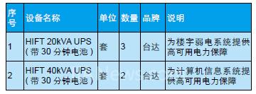 經過綜合比較,臺達UPS為客戶提供的HIFT高智能容錯UPS滿足了客戶的全方面需求,無論是在高可用性方面,還是高效節(jié)能方面,都為客戶提供了優(yōu)異的解決方案。此次選用了HIFT UPS 5臺,詳細配置如右表: