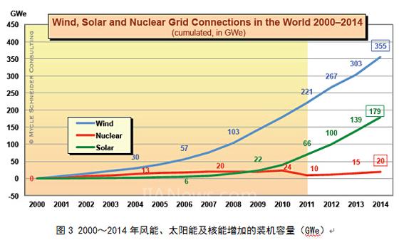 投資:2014年全球可再生能源的投資總額為2700億美元,比上一年同比增長(zhǎng)17%,幾乎與2011年的投資總額2780億美元持平,是2004年相應(yīng)投資總額的4倍。2014年中國(guó)的可再生能源投資總額為830億美元,占世界的31%。全球核電站的投資仍低于可再生能源投資的一個(gè)量級(jí)。
