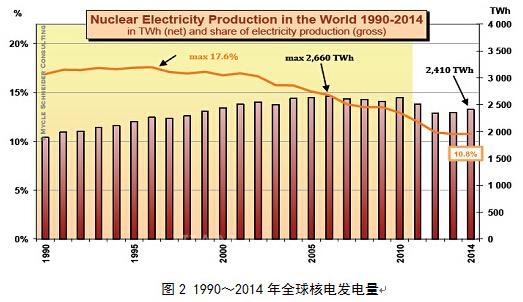 反應(yīng)堆運(yùn)行:全球共有31個(gè)國(guó)家正在運(yùn)行核反應(yīng)堆,核反應(yīng)堆共有391座,總裝機(jī)容量達(dá)到337GW(圖1)。2014年核電發(fā)電量為2410TWh,與2013年相比增長(zhǎng)2.2%,但仍比2006年最高點(diǎn)低9.4%,見(jiàn)圖2。在2014年日本尚無(wú)反應(yīng)堆運(yùn)行。
