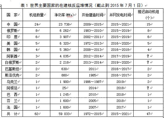 建造:與往年一樣,14個(gè)國(guó)家正在建造新的核電站。截止到2015年7月,62座核反應(yīng)堆正在建造,裝機(jī)容量達(dá)到59GW。近40%的新建項(xiàng)目位于中國(guó)。具體情況見(jiàn)表1。
