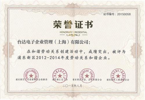 在曹路鎮(zhèn)政府推薦下,臺(tái)達(dá)獲評(píng)“2012-2014年度浦東新區(qū)勞動(dòng)關(guān)系和諧企業(yè)”,獲得主辦方的肯定。
