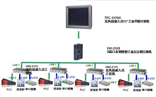 利用研華嵌入式無風(fēng)扇控制器UNO-2170,作為數(shù)據(jù)轉(zhuǎn)換平臺,收集由下位包括PLC,流量計(jì)中讀取的信號,并通過研華EKI-2528傳輸?shù)缴衔粰C(jī)進(jìn)行監(jiān)控。針對于系統(tǒng)問題,由研華將系統(tǒng)以及客戶的相應(yīng)工藝以及backoff的軟件進(jìn)行剪裁,保證了系統(tǒng)的穩(wěn)定。