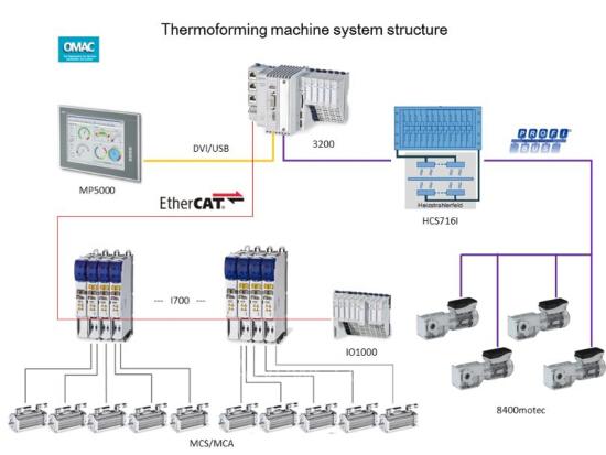 Lenze 可提供整套系統(tǒng)解決方案,以四工位高速成型機(jī)為例,系統(tǒng)以 3200C 運(yùn)動(dòng)控制器為核心,組態(tài) 8 臺(tái) i700 伺服控制器驅(qū)動(dòng) MCA 電機(jī),完成片材的送料、成型、沖孔、裁剪及堆疊等功能。采用 Lenze 標(biāo)準(zhǔn)運(yùn)動(dòng)控制功能,完成各個(gè)軸的抱閘、回零、定位及運(yùn)動(dòng)曲線控制功能,減少了系統(tǒng)的開(kāi)發(fā)周期并提高了重復(fù)利用率。