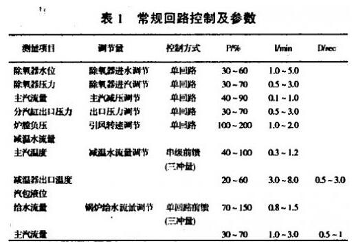 除氧水位、除氧壓力、除氧氣減壓、分汽缸出口穩(wěn)壓、爐膛負壓等是常規(guī)的單回路調(diào)節(jié)。主汽溫度、汽包水位多采用單回路前饋或串級加前饋(:=三沖量)組成。常規(guī)回路及P、I、D參數(shù)調(diào)節(jié)參見表1。