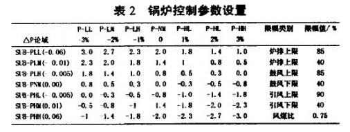 鍋爐參數(shù)中,主汽壓力(或過熱蒸汽壓力)是衡量蒸汽量與外界負荷兩者是否適應的指標。引起主汽壓力變動的擾動來源有兩個:一是燃料量的擾動,為基本擾動;——是用汽量的擾動。為負荷擾動。基本擾動可以通過自身的閉環(huán)來克服,負荷擾動則不易做到。負荷變化時母管壓力出現(xiàn)瞬時改變,而調(diào)節(jié)通道的遲延較大,對象擾動通道與調(diào)節(jié)通道的動態(tài)甚為懸殊。調(diào)節(jié)很不利。根據(jù)司爐工經(jīng)驗,煤從進入爐膛到完全燃燒需要20min以上。常規(guī)的P、I、D調(diào)節(jié)跟隨性較差,無法完成這樣一個大滯后系統(tǒng)的自動調(diào)節(jié)。采用基于模糊理論的專家系統(tǒng)[l],可較好地實現(xiàn)對鍋爐燃燒系統(tǒng)的自動控制。表2是基于專家系統(tǒng)的控制參數(shù)規(guī)則表。其中P論域表示模糊控制中鍋爐壓力的論域,AP論域表示兩個運行周期鍋爐壓力變化差的論域。燃燒周期的自動調(diào)整,加快了負荷大幅變化時燃燒控制的響應速度。煤質(zhì)或爐況的不同對調(diào)節(jié)效果有一定的影響。由于隸屬度函數(shù)的曲線均相互交錯重疊,岡此模糊控制算法對于參數(shù)變化的適應性具有較強的魯棒性。實際運行驗證了這一特點。