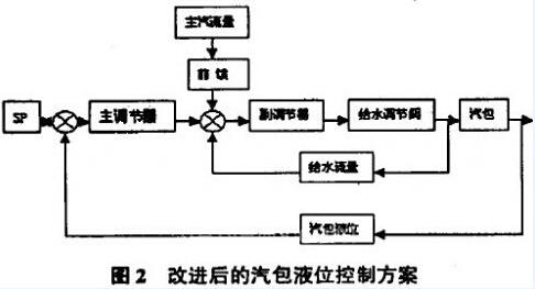 通過分析發(fā)現(xiàn),調(diào)節(jié)器的輸人為:汽包液位設定值-汽包液位測量值+主蒸汽流量-給水流量。實際運行中由于各種擾動的影響。給水流域和主蒸汽流量幾乎不可能相等。該方案的控制結(jié)果將使汽包液位產(chǎn)生靜差。為此,采用在三沖量基礎上的串級控制方案。如圖2所示。由于主調(diào)節(jié)器的作用。該方案較好地消除了靜差。