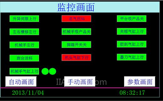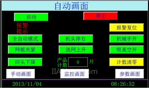 1、自動(dòng)畫面:設(shè)備運(yùn)行時(shí)的主畫面,控制設(shè)備的啟停、報(bào)警顯示及一些繼電器的開關(guān)。