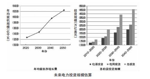 拉動(dòng)全球經(jīng)濟(jì)增長(zhǎng)。為實(shí)現(xiàn)2050年全球能源的低碳清潔發(fā)展,預(yù)計(jì)到2050年全球發(fā)電裝機(jī)規(guī)模將達(dá)到350億千瓦,比2020年增長(zhǎng)約300億千瓦。以十年為一個(gè)階段來(lái)看,未來(lái)電源裝機(jī)呈快速增長(zhǎng)態(tài)勢(shì),與此相應(yīng)的是電力投資規(guī)模也呈快速增長(zhǎng)態(tài)勢(shì)。
