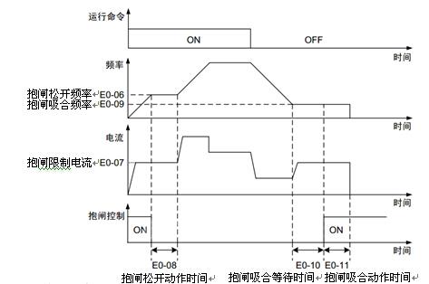 5. 適用于提升系統(tǒng)的抱閘控制,通過對驅動器內部輸出電流和頻率的精確控制避免絞車啟動、停止時的溜車,同時還避免啟動過流跳閘現象,控制圖如下: