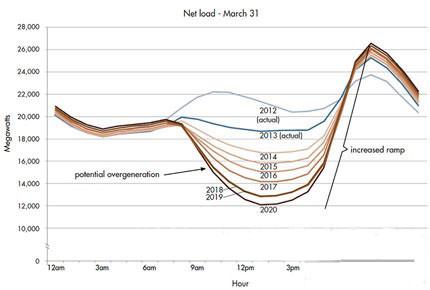 從該圖可以看出,傍晚到夜間出現(xiàn)了緊急的調(diào)整需求。出處:CAISO Demand Response and Energy Efficiency Roadmap