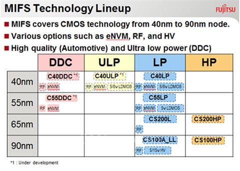 降低功耗并控制成本是IoT市場的關(guān)鍵,已成為半導(dǎo)體行業(yè)的最大課題之一,MIFS通過改善成本效率最為出色的平面CMOS工藝技術(shù)來解決這一問題。MIFS覆蓋了從40-90nm節(jié)點的低功耗CMOS技術(shù),提供eNVM、RF和HV多種選項,可支持汽車應(yīng)用等高品質(zhì)要求的,超級低功耗應(yīng)用的DDC工藝新技術(shù)是由美國SuVolta, Inc.開發(fā),而三重富士通半導(dǎo)體將制程工藝技術(shù)開發(fā)完成,并開始逐步量產(chǎn),DDC具有在超低電壓下可保持運作的晶體管與超低漏電晶體管技術(shù)。