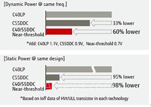 倉田創(chuàng)部長舉例說道:“在相同的運行速度下,55nm DDC較傳統(tǒng)55nm CMOS工藝降低了46%的總體功耗,較傳統(tǒng)40nm工藝降低了18%。此外,超低漏電晶體管也將泄漏電流從皮安培(pA)降低到毫微微安培(fA)?!?/FONT>