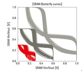 2) 降低SRAM的Vddmin:如果降低Vdd的同時增加Vt的話,SRAM的電池操作一般會變得不穩(wěn)定。DDC可以實現(xiàn)在Vdd極低的條件下運作SRAM。即便是在Vdd=0.3V的情況下,基于DDC的SRAM蝴蝶曲線依然展現(xiàn)出明顯的兩扇窗口的模樣。