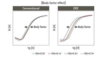 3) 強(qiáng)大基體因子(Body Factor)效應(yīng):DDC晶體管的body bias(Vbb)系數(shù)要強(qiáng)于傳統(tǒng)的晶體管。因此,DDC可以實現(xiàn)Vt的靈活控制。