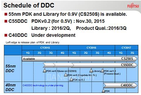 下圖是三重富士通的DDC工藝發(fā)展路線圖,2015年11月底該公司已開始提供PDK的“C55DDC”還可為客戶量身打造提供低功耗方案,包括提供靈活的工藝優(yōu)化、參數(shù)調(diào)整等服務(wù)。并且,如果客戶的產(chǎn)品已經(jīng)在別的foundry運行過,也可以到三重富士通的工廠生產(chǎn),其技術(shù)人員會幫助調(diào)整參數(shù),減少客戶開發(fā)難度。