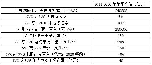 隨著近年來(lái)國(guó)家對(duì)電能質(zhì)量和節(jié)能減排的重視,老一代負(fù)荷無(wú)功補(bǔ)償設(shè)備,如并聯(lián)電容器,已開(kāi)始越來(lái)越多被SVC等替代。隨著我國(guó)智能電網(wǎng)建設(shè)的推進(jìn),SVC(或SVG)的運(yùn)用將更加廣泛。假設(shè)2020年我國(guó)現(xiàn)有35kV以上輸變電線路80%配備SVC(或SVG),則未來(lái)十年來(lái)自電網(wǎng)的年均需求可達(dá)40億元左右。