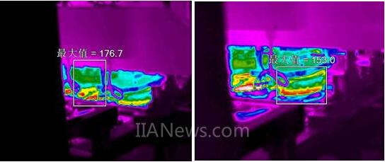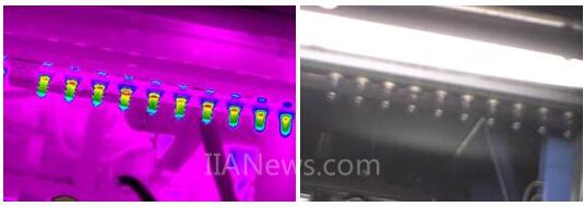在瓶裝飲料的灌裝生產(chǎn)線上,通常在灌裝前需要對(duì)包裝瓶進(jìn)行消毒,即將消毒液混合高溫蒸汽對(duì)包裝瓶?jī)?nèi)部進(jìn)行噴灌,以達(dá)到充分消毒目的,美國(guó)福祿克熱像儀可以檢測(cè)消毒過程中發(fā)生的噴霧不均勻的現(xiàn)場(chǎng),從而調(diào)整噴霧工藝,避免因消毒不良而發(fā)生的食品安全事故。