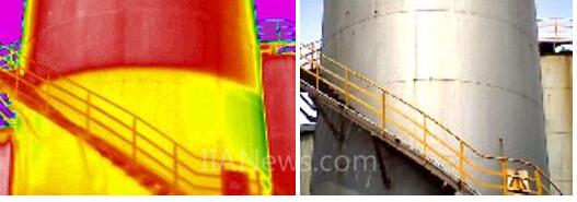 儲(chǔ)罐雖然有液位計(jì)對(duì)液位進(jìn)行控制,但液位計(jì)的失靈會(huì)導(dǎo)致空罐和滿罐,使生產(chǎn)突然中斷或造成儲(chǔ)罐溢出事故,造成巨大損失;紅外熱像儀可以直接在外表面拍攝出液位線,幫助設(shè)備維護(hù)人員及時(shí)發(fā)現(xiàn)有故障的液位計(jì),或者對(duì)存儲(chǔ)容量有明顯偏差的罐體進(jìn)行深入檢測(cè),避免潛在的危險(xiǎn)。