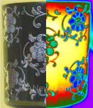 細看這幅熱圖像,可能認為樹葉的表觀溫度要比杯子的表觀溫度低。實際上,它們的溫度相同,紅外輻射強度差異是因輻射率不同所引起。