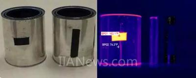 本例展示了貼有膠帶的兩個罐子。左邊的罐子裝滿熱水,右邊的罐子僅處于常溫之下。對前者而言,從膠帶讀出的溫度為72.8?C,從罐子讀出的溫度為23.5?C。由于罐子的發(fā)射率較低,后者的讀數(shù)基本上為環(huán)境讀數(shù)。這是一個十分經典的案例,說明了高發(fā)射率應用于低發(fā)射率目標的必要性。