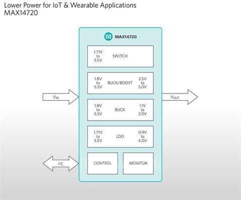 延長電池使用壽命、實現(xiàn)低功耗設(shè)計是可穿戴和IoT產(chǎn)品工程師所面臨的共同挑戰(zhàn)。MAX14720 PMIC主要面向?qū)Τ叽绾湍苄б髧栏竦姆浅潆婋姵?紐扣電池、堿性電池)供電應(yīng)用。此外,電池保鮮功能在主電源首次上電之前,斷開電路與電池的連接,可有效延長存放時間。通過集成五大分立功能電路(電源開關(guān)、線性穩(wěn)壓器、降壓調(diào)節(jié)器、buck-boost調(diào)節(jié)器和監(jiān)測器),MAX14720大大縮減了材料清單(BOM),可實現(xiàn)超小尺寸設(shè)計。