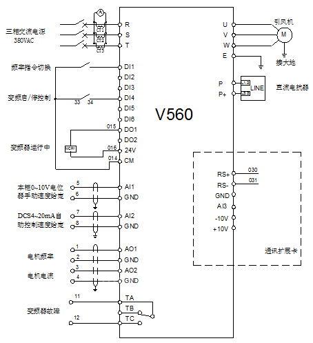 引風(fēng)機(jī)和鼓風(fēng)機(jī)控制著鍋爐爐膛內(nèi)的壓力,引風(fēng)量隨著鼓風(fēng)量的變化作相應(yīng)的調(diào)整,使鍋爐內(nèi)部始終保持一定負(fù)壓值,確保整個(gè)燃燒系統(tǒng)的穩(wěn)定性。引風(fēng)機(jī)采用1臺(tái)V560-4T6300G變頻器驅(qū)動(dòng),鼓風(fēng)機(jī)采用1臺(tái)V560-4T1850G變頻器驅(qū)動(dòng)??刂品绞讲捎帽竟?手動(dòng)控制)/DCS(自動(dòng)控制)控制,變頻器通過(guò)DI端子選擇頻率源,手動(dòng)調(diào)節(jié)頻率采用本柜電位器給定0~10V信號(hào)(模擬輸入AI1-GND)控制電機(jī)轉(zhuǎn)速,自動(dòng)控制頻率采用DCS給定4~20mA信號(hào)(模擬輸入AI2-GND)控制電機(jī)轉(zhuǎn)速,起/停由本柜端子控制,同時(shí)具有起/停、故障報(bào)警狀態(tài)指示,急停裝置;電機(jī)轉(zhuǎn)速值和電流值分別以4~20mA信號(hào)(模擬輸AO1-GND、AO2-GND)輸出反饋給DCS控制器作為運(yùn)行狀態(tài)監(jiān)控。以引風(fēng)機(jī)為例,V560系列變頻器的控制線路如下圖2所示: