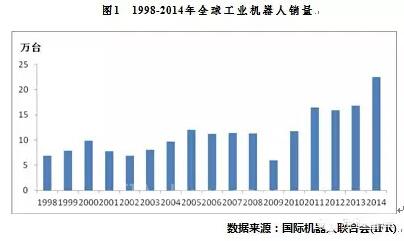 2015年以來(lái),國(guó)際經(jīng)濟(jì)形勢(shì)不容樂(lè)觀,全球經(jīng)濟(jì)復(fù)蘇緩慢,地緣政治及突發(fā)事件風(fēng)險(xiǎn)上升。但隨著新一輪科技革命和產(chǎn)業(yè)變革的孕育興起,以信息技術(shù)與制造技術(shù)融合為核心的智能制造、數(shù)字制造、網(wǎng)絡(luò)制造等新型制造模式正在加快發(fā)展,發(fā)達(dá)工業(yè)國(guó)家和地區(qū)均高度重視機(jī)器人產(chǎn)業(yè)發(fā)展,將機(jī)器人產(chǎn)業(yè)上升為國(guó)家戰(zhàn)略,以上因素使得全球機(jī)器人產(chǎn)業(yè)保持快速發(fā)展,其中亞洲市場(chǎng)反應(yīng)尤為活躍。據(jù)國(guó)際機(jī)器人聯(lián)合會(huì)統(tǒng)計(jì),2014年全球工業(yè)機(jī)器人銷量為22.5萬(wàn)臺(tái),比2013年增長(zhǎng)27%,其中亞洲銷量約占2/3,中國(guó)、韓國(guó)、日本、美國(guó)和德國(guó)五大市場(chǎng)的銷量占全球工業(yè)機(jī)器人總銷量的75%左右。2005-2014近10年間,全球新裝工業(yè)機(jī)器人年均增速約為14%。