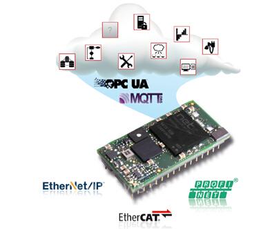 netIOT嵌入式模塊netIC模塊基于netX 52多協(xié)議芯片,產(chǎn)品依然通過SPI或者M(jìn)odbus串行方式與用戶設(shè)備連接,為用戶拓展工業(yè)以太網(wǎng)網(wǎng)絡(luò)通訊接口,同時(shí)用戶能夠在同一根物理線纜上通過OPC UA或MQTT方式與實(shí)時(shí)以太網(wǎng)通訊并行地將數(shù)據(jù)傳輸?shù)皆品?wù)器,供大數(shù)據(jù)分析,而不會影響PLC數(shù)據(jù)通訊。實(shí)現(xiàn)符合工業(yè)4.0要求的現(xiàn)場智能云設(shè)備。