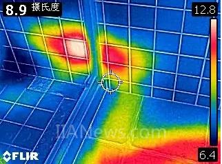 在現(xiàn)場,我們看到漏水點在一個客臥內(nèi),墻上溫度很高(如上圖),而且就緊挨著衛(wèi)生間的第三路。據(jù)此我們初步判斷,可能是衛(wèi)生間墻內(nèi)的第三路漏水導(dǎo)致客臥漏水。第四步,我們來到衛(wèi)生間,檢測墻面上相應(yīng)的位置,發(fā)現(xiàn)某一個區(qū)域溫度較高,但不是傳統(tǒng)的管路形狀,而是一個區(qū)域內(nèi)都是熱的。