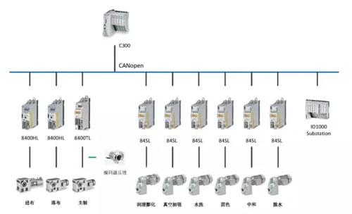 上位控制器c300通過CANopen總線與連接在同一網(wǎng)絡中的各個8400 StateLine驅(qū)動器進行高速實時的數(shù)據(jù)交互,采集各個工位的速度或其他重要參數(shù)的數(shù)值,經(jīng)由內(nèi)部高速內(nèi)核完成運算處理,并根據(jù)工藝要求將優(yōu)化控制的命令快速傳達到每個工位的變頻器,高效快捷地實現(xiàn)各個工位之間的高精度同步控制。