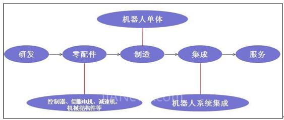 中投顧問在《2016-2020年中國機(jī)器人產(chǎn)業(yè)投資分析及前景預(yù)測報告》中指出,機(jī)器人行業(yè)的產(chǎn)業(yè)鏈可分為五個部分,分別是研發(fā)、零配件生產(chǎn)、機(jī)器人單體制造、系統(tǒng)集成和售后服務(wù)。
