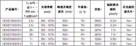 VEMD1060X01、VEMD5060X01和VEMD6060X01是透明的,感光靈敏度從380nm到1070nm,可用于探測(cè)可見光和近紅外輻射。VEMD1160X01、VEMD5160X01和VEMD6160X01是黑色的,帶有日光阻擋濾光片,可用于700nm~1070nm的紅外應(yīng)用。