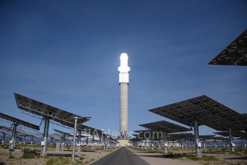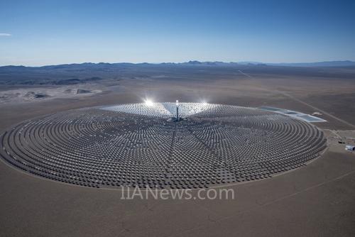 SolarReserve位于美國內華達州的110兆瓦的“新月沙丘太陽能計劃”共設置10,347片的大型追日鏡。透過臺達太陽能追日自動化系統(tǒng)控制每一片追日鏡,根據(jù)日照角度及每個追日鏡所在不同的位置,將日光準確反射到中央540英尺高的發(fā)電塔上高超過100英尺的大型接受器。接受器內的熔鹽(molten salt)吸收來自陽光的熱量后其溫度將升高至1050°F(566℃)以上,然后流入儲存槽,將熱能儲存起來,作為蒸氣渦輪發(fā)電機組的熱源,以進行發(fā)電。此熔鹽儲能系統(tǒng)可以儲存10小時的日照所產(chǎn)生的太陽能,即使在天候不良或夜間時段,也能夠正常供電。