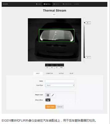 Eigen Innovations成功的將Eigen智能模塊應(yīng)用于一家汽車制造商客戶。具體來說,是將Eigen智能模塊和FLIR熱像儀安裝在汽車裝配線上進(jìn)行后車窗除霧器檢測(cè)。在該裝配線上,打開除霧器,使用FLIR A系列熱像儀檢測(cè)加熱器是否運(yùn)行正常。