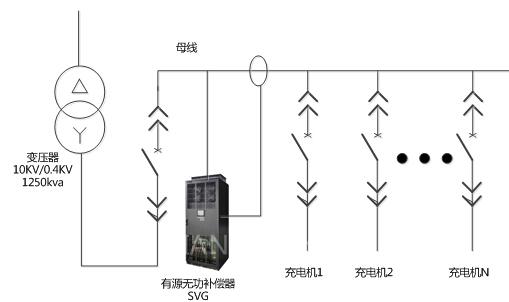 通過對客戶問題的分析,臺達技術人員在配電系統(tǒng)中添加了臺達有源無功補償器SVG2000進行電能質(zhì)量治理,使得配電系統(tǒng)系統(tǒng)功率因數(shù)始終保持在+0.95以上。下圖是為充電站配置臺達有源無功補償器SVG2000系列的配電系統(tǒng)架構。