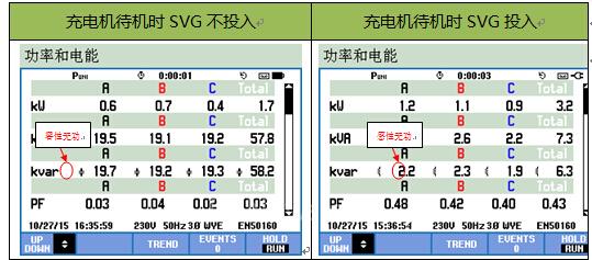 通過FLUKE測試,顯示充電機待機時,SVG2000投入前功率因數(shù)為-0.03,投入后為0.43,成功將配電系統(tǒng)容性無功倒送補償成系統(tǒng)感性無功,大大減少了充電機待機時對配電系統(tǒng)的無功倒送。