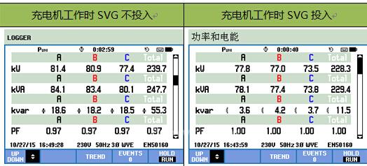 通過FLUKE測試,顯示充電機工作時,SVG2000投入前功率因數(shù)為-0.97,表明充電機上電后無論充電與否都會向配電系統(tǒng)倒送無功,投入后功率因數(shù)達到1.0。