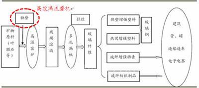 該企業(yè)生產(chǎn)玻璃纖維采用的是一次成型-池窯拉絲法,該工藝過(guò)程比較簡(jiǎn)單,其工藝流程圖如下所示: