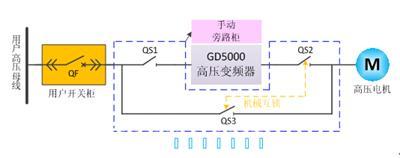高效渦流磨機(jī)系統(tǒng)主要由用戶高壓開(kāi)關(guān)柜,GD5000高壓變頻器,驅(qū)動(dòng)電機(jī),磨機(jī),等設(shè)備組成,變頻狀態(tài)下,旁路柜刀閘狀態(tài)是QS1,QS2閉合,QS3斷開(kāi),當(dāng)變頻器出現(xiàn)故障或者檢修時(shí),斷開(kāi)QS1,QS2,閉合QS3磨機(jī)工頻運(yùn)行,旁路柜完全遵循柜體“五防”設(shè)計(jì)要求,保證系統(tǒng)安全穩(wěn)定運(yùn)行。