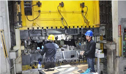 東莞橫瀝鎮(zhèn)的中泰模具廠,兩名工人正在生產(chǎn)某汽車零部件