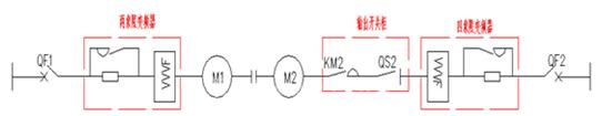 QF1合閘,電網電源經10KV母線提供試驗電源,兩象限變頻器給拖動電動機M1供電,其同軸聯(lián)接的電機M2經四象限站用變頻器聯(lián)接至電網。負載電機M2及四象限站用變頻器采用成熟的技術,具備預置轉矩功能。聯(lián)接試驗系統(tǒng)中的電氣線路保證電能流向可逆,以滿足今后被試變頻器的四象限運行試驗。試驗回路如下: