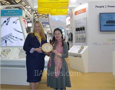 標(biāo)題 1: 馬艾倫博士(圖左)代表浩亭中國接受工控網(wǎng)副總經(jīng)理余雁女士(圖右)頒獎(jiǎng)