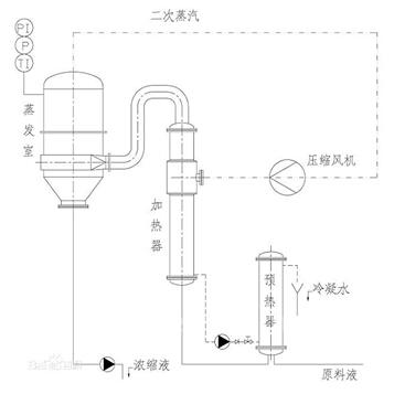 溶液在一個降膜蒸發(fā)器里,通過物料循環(huán)泵在加熱管內(nèi)循環(huán)。初始蒸汽用新鮮蒸汽在管外給熱,將溶液加熱沸騰產(chǎn)生二次汽,產(chǎn)生的二次汽由渦輪增壓風機吸入,經(jīng)增壓后,二次汽溫度提高,作為加熱熱源進入加熱室循環(huán)蒸發(fā)。正常啟動后,渦輪壓縮機將二次蒸汽吸入,經(jīng)增壓后變?yōu)榧訜嵴羝瓦@樣源源不斷進行循環(huán)蒸發(fā)。蒸發(fā)出的水分最終變成冷凝水排出