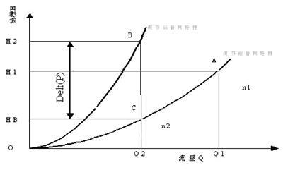 當所需風量、流量從Q1減小到Q2時,如果采用調(diào)節(jié)擋板的辦法,管網(wǎng)阻力將會增加,管網(wǎng)特性曲線上移,系統(tǒng)的運行工況點從A點變到新的運行工況點B點運行,所需軸功率P2與面積H2×Q2成正比;如果采用調(diào)速控制方式,風機轉(zhuǎn)速由n1下降到n2,其管網(wǎng)特性并不發(fā)生改變,但風機的特性曲線將下移,因此其運行工況點由A點移至C點。此時所需軸功率P3與面積HB×Q2成正比。從理論上分析,所節(jié)約的軸功率Delt(P)與(H2-HB)×(C-B)的面積成正比。