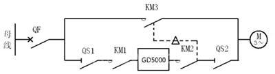 變頻調(diào)速系統(tǒng)由用戶開關(guān)、自動旁路柜、GD5000系列高壓變頻器、高壓電機組成。旁路柜是由三個真空高壓接觸器KM1、KM2、KM3和高壓隔離開關(guān)QS1、QS2組成。正常運行時QS1、QS2全部閉合,只有在檢修時斷開。電機以變頻方式運行時, KM1、KM2閉合,QS3斷開;電機以工頻方式運行時,KM3閉合, KM1、KM2斷開。變頻與工頻之間切換自動/手動完成。旁路柜嚴格按照“五防”聯(lián)鎖要求設(shè)計,變頻輸出開關(guān)KM2和工頻開關(guān)KM3互鎖,完全能夠保證變頻調(diào)速系統(tǒng)安全運行。